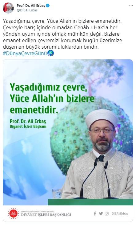 Erbaş, 5 Haziran Dünya Çevre Günü dolayısıyla yayımladığı mesajda, şunları kaydetti: