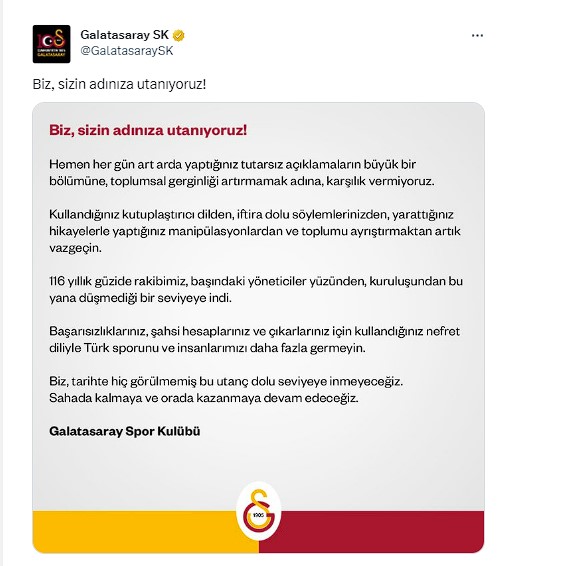 Galatasaray'ın açıklamasında, "116 yıllık güzide rakibimiz, başındaki yöneticiler yüzünden, kuruluşundan bu yana düşmediği bir seviyeye indi." denildi.