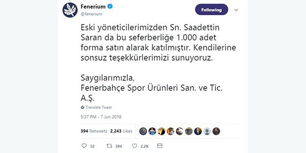 Fenerbahçe'nin resmi ürünlerini tedarik eden Fenerium, twitter hesabı üzerinde Sadettin Saran'a teşekkür mesajı yayımladı.