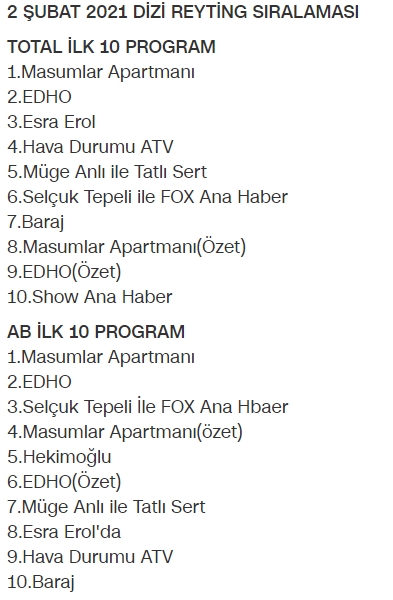 Salı akşamları izleyicilerle buluşmakta olan 4 dizi var ve reyting sonuçlarında da Masumlar Apartmanı birinciliğini tüm kategorilerde sürdürürken, Eşkıya Dünyaya Hükümdar Olmaz dizisi de yine tüm kategorilerde ikincilik elde etmeye devam etti.