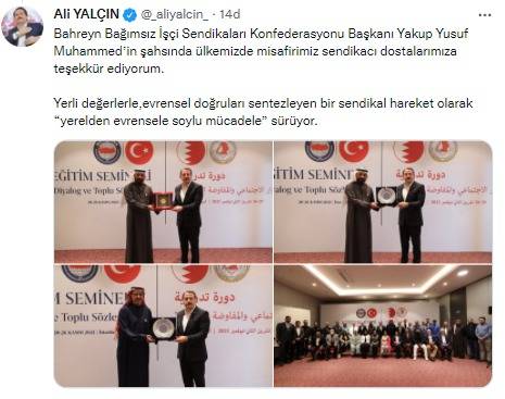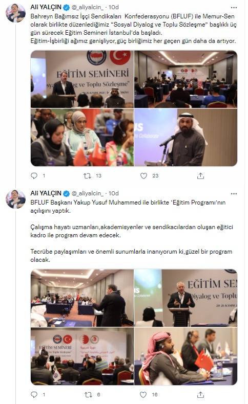 Memur-Sen Konfederasyonu ve Bahreyn Bağımsız İşçi Sendikaları Konfederasyonu’nun (BFLUF) birlikte düzenlediği “Sosyal Diyalog ve Toplu Sözleşme” eğitim Semineri İstanbul’da başladı. Söz konusu seminere ilişkin sosyal medya hesabından paylaşımlar yapan Memur-Sen Konfederasyonu ve Eğitim-Bir Sen Genel Başkanı Ali Yalçın, “Bahreyn Bağımsız İşçi Sendikaları Konfederasyonu (BFLUF) ile Memur-Sen olarak birlikte düzenlediğimiz “Sosyal Diyalog ve Toplu Sözleşme” başlıklı üç gün sürecek Eğitim Semineri İstanbul’da başladı. Eğitim-İşbirliği ağımız genişliyor, güç birliğimiz her geçen gün daha da artıyor. BFLUF Başkanı Yakup Yusuf Muhammed ile birlikte ‘Eğitim Programı’nın açılışını yaptık. Çalışma hayatı uzmanları, akademisyenler ve sendikacılardan oluşan eğitici kadro ile program devam edecek. Tecrübe paylaşımları ve önemli sunumlarla inanıyorum ki, güzel bir program olacak. Bahreyn Bağımsız İşçi Sendikaları Konfederasyonu Başkanı Yakup Yusuf Muhammed’in şahsında ülkemizde misafirimiz sendikacı dostalarımıza teşekkür ediyorum. Yerli değerlerle, evrensel doğruları sentezleyen bir sendikal hareket olarak ‘yerelden evrensele soylu mücadele’ sürüyor” ifadelerini kullandı.