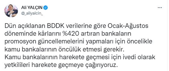 Memur-Sen ve Eğitim-Bir-Sen Genel Başkanı Ali Yalçın “Açıklanan BDDK verilerine göre Ocak-Ağustos döneminde kârlarını yüzde 420 artıran bankaların promosyon güncellemelerini yapmaları için öncelikle kamu bankalarının öncülük etmesi gerekir. Kamu bankalarının harekete geçmesi için ivedi olarak yetkilileri harekete geçmeye çağırıyoruz” ifadelerini kullandı.