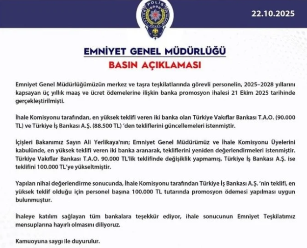 Emniyet Genel Müdürlüğü (EGM), üç yıllık banka promosyon ihalesinin İş Bankası tarafından kazanıldığını açıkladı. İhalede en son 88 bin 500 lira veren İş Bankası'nın İçişleri Bakanı Ali Yerlikaya'nın telefonundan sonra teklifini 100 bin liraya çıkarması dikkat çekti.