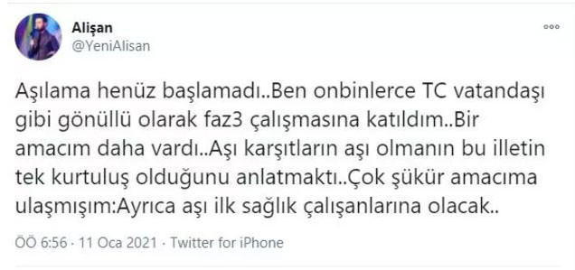 Alişan, korona aşısına ilişkin, “Ben on binlerce TC vatandaşı gibi gönüllü olarak FAZ 3 çalışmasına katıldım.” açıklamasında bulundu. Alişan'dan açıklama geldi. Alişan açıklamasında "Aşılama henüz başlamadı. Ben on binlerce TC vatandaşı gibi gönüllü olarak FAZ 3 çalışmasına katıldım. Bir amacım daha vardı. Aşı karşıtlarına aşı olmanın bu illetin tek kurtuluş olduğunu anlatmaktı. Çok şükür amacıma ulaşmışım: Ayrıca aşı ilk sağlık çalışanlarına olacak" dedi.