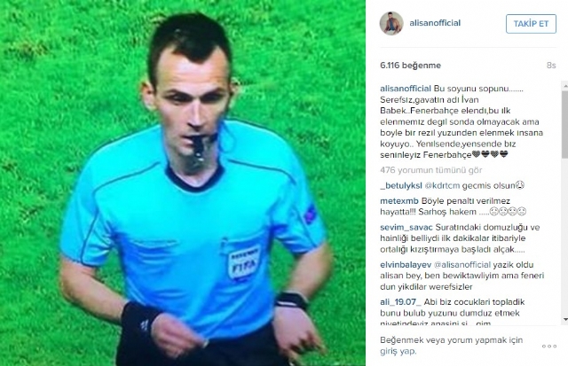 UEFA Avrupa Ligi son 16 turu rövanş maçında Braga deplasmanına konuk olan ve sahadan 4-1 mağlup ayrılan Fenerbahçe'de taraftarlar karşılaşmanın hakemi Ivan Bebek'in kararları karşısında çılgına döndüler. Sosyal medyadan tepkilerini gösteren Sarı Lacivertli taraftarlara şarkıcı Alişan da katıldı. Ünlü şarkıcı kendisine ait sosyal medya hesabından maçın hakemi ile ilgili, "Hakem Hırvat değil tam bir g..at şerefsiz" ifadelerini paylaştı.
