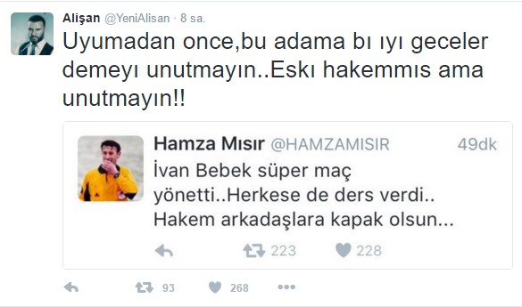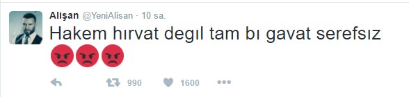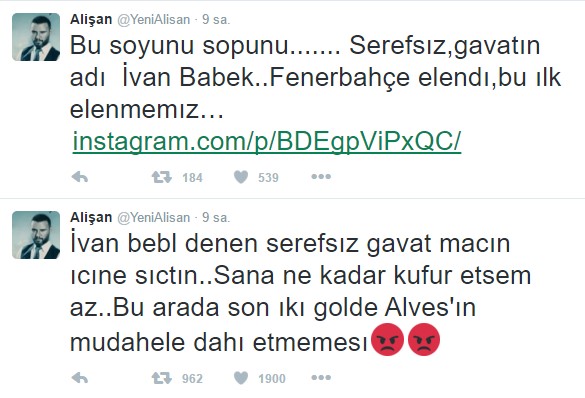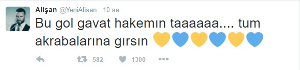 Alper Potuk'un ilk yarının sonlarıa doğru bulduğu golden sonra hızını alamayan Alişan, devamında "Bu gol g..at hakemın taaaaaa.... tum akrabalarına g...n" mesajını yayınladı.