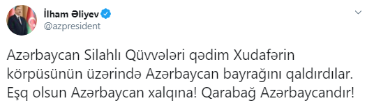 Müjdeyi Twitter hesabından duyuran Aliyev, "Azerbaycan Silahlı Kuvvetleri tarihi Hudaferin Köprüsü'ne Azerbaycan bayrağı dikti. Yaşasın Azerbaycan halkı. Karabağ Azerbaycan'dır." ifadelerini kullandı.