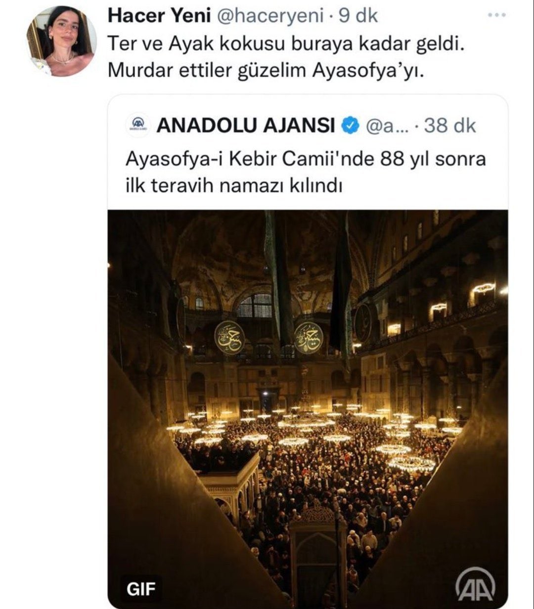 88 yıl sonra ibadete açılan Ayasofya Camii’nde, Ramazan dolayısıyla ilk kez teravih namazı kılınmasına Hacer Yeni isimli ‘densiz’ alçakça sözler sarfetmişti.