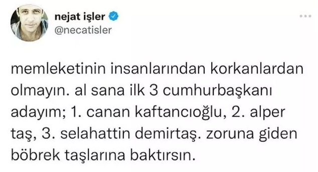 "Memleketinin insanlarından korkanlardan olmayın! Al sana ilk 3 cumhurbaşkanı adayım: Canan Kaftancıoğlu, Alper Taş, Selahattin Demirtaş. Zoruna giden böbrek taşlarına baktırsın.