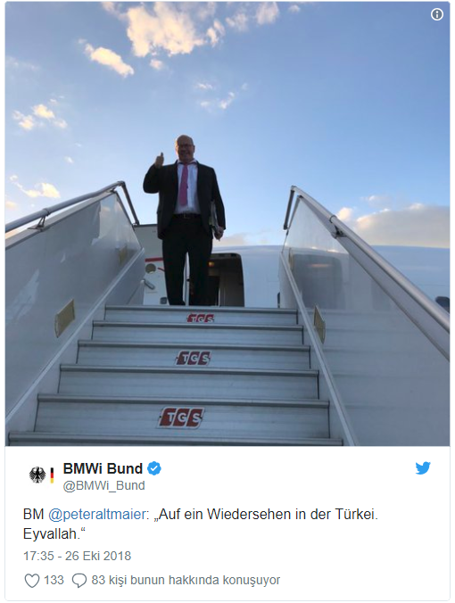 Türkiye'de bulunduğu süre içerisinde sıcak tavırlarıyla dikkati çeken Alman Bakan, ülkemizde ayrılırken paylaştığı sosyal medya mesajıyla da Türkiye'ye sempatisini gösterdi. Dönüş uçağının kapısında çekildiği fotoğrafını Almanya Ekonomi Bakanlığı'nın resmi Twitter hesabından paylaşan Altmaier, önce Almanca olarak “Yeniden görüşmek üzere Türkiye” yazarken, mesajın sonuna Türkçe olarak “Eyvallah” kelimesini ekledi.