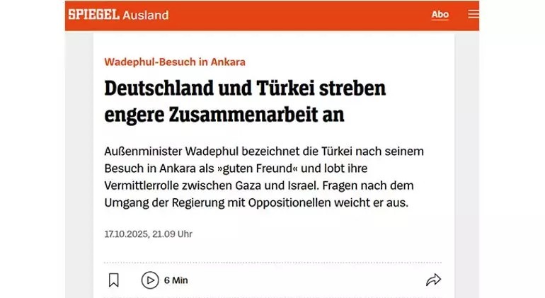 Almanya’nın önde gelen gazetelerinden Der Spiegel ise haberinde “Wadephul, Türkiye’yi ‘iyi bir dost’ olarak nitelendirdi. Gazze ateşkesindeki arabuluculuk rolünü övdü” ifadelerini kullandı.