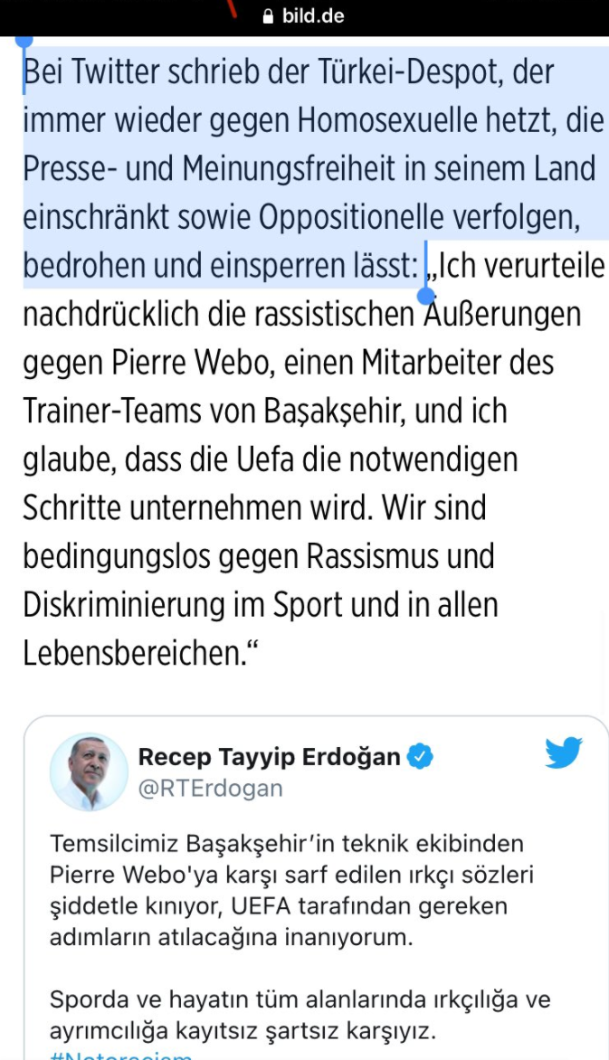 Başakşehir Yardımcı Antrenörü Pierre Webo'ya PSG-Medipol Başakşehir'in Rumen hakemi tarafından yapılan ırkçılığı kınayan Cumhurbaşkanı Recep Tayyip Erdoğan'ın mesajını veren Alman Bild gazetesi, Erdoğan hakkında, "Eşcinselleri defalarca kışkırtan, ülkesinde basın özgürlüğünü ve ifade özgürlüğünü kısıtlayan ve muhaliflere zulüm, tehdit ve hapis cezası veren despot lider Twitter'da şunları yazdı." diyerek büyük bir skandala imza attı.