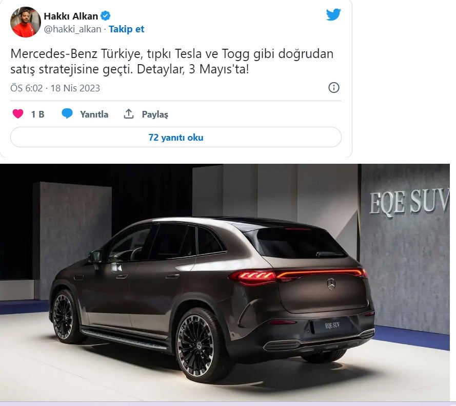 Geçtiğimiz yıl kasım ayında Habertürk'e konuşan Mercedes-Benz Otomotiv İcra Kurulu ve Otomobil Grubu Başkanı Şükrü Bekdikhan, "Otomobil satışında dünyada üç farklı strateji gündemde. Birincisi Tesla ve Togg'un benimsediği gibi arada bayi olmadan doğrudan satış. İkincisi bayinin teslim noktası olduğu ama son fiyatın genel merkezden belirlendiği model. Üçüncüsü ise son fiyatın bayi tarafından belirlendiği ve bayinin teslim noktası olduğu model. Bu üç modelden birini seçeceğiz" demişti.