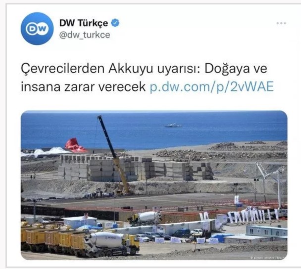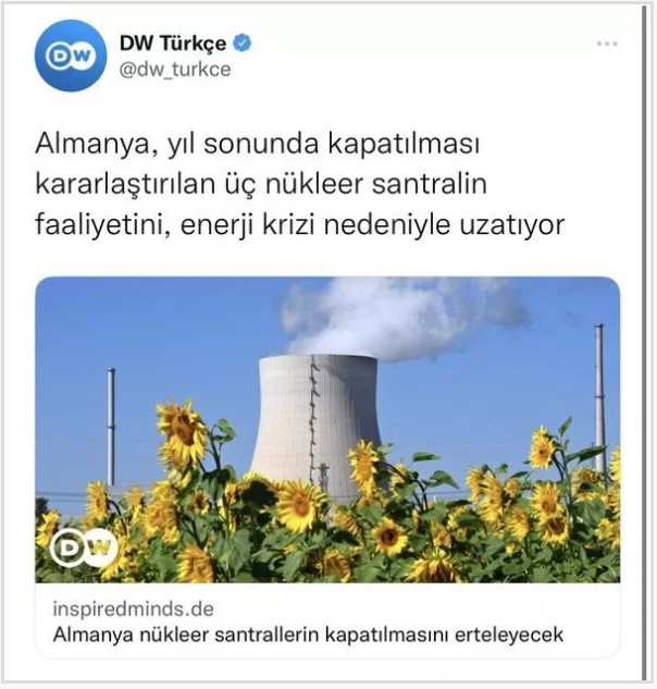 Alman Devleti tarafından fonlanan medya kurumu Deutsche Welle'nin (DW) Türkçe hesabı, Almanya'da nükleer santrallerin çalışma süresini memnuniyetle karşılarken, Türkiye'de yapılan nükleer santrali eleştirmesi dikkat çekti.