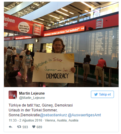 Alman vatandaşı olan Müslüman gazeteci Martin Lejeune, Avusturya'da görülen "Türkiye tatili ile sadece Erdoğan'ı destekliyorsunuz, gitmeyin!" rezilliğinin ardından harekete geçti. Provokatif reklamın yer aldığı Viyana Havalimanı'na giden Lejeune, "Türkiye de tatil: Yaz, Güneş, Demokrasi" ifadelerinin yer aldığı yazıyla fotoğraf çektirdi.