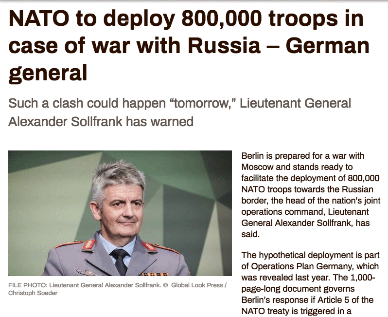 Bu durumda Almanya, doğu sınırına 800 bin (NATO) askeri konuşlandırmayı organize edebilir. Alman ordusunun (Bundeswehr) 7 Kasım’da Berlin’de düzenlenen yıllık konferansında konuşan Sollfrank, planın geçen yıl yayınlanan ve Berlin’in Moskova ile olası bir çatışma durumunda Almanya’yı NATO’nun ana lojistik merkezine nasıl dönüştüreceğini öngören bin sayfalık “Operationsplan Deutschland” adlı belgenin bir parçası olduğunu söyledi.