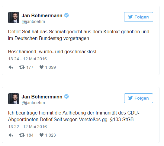 Alman Hıristiyan Demokrat Birliği Partisi (CDU) milletvekili Detlef Seif, Böhmermann'ın Cumhurbaşkanı Recep Tayyip Erdoğan'a yönelik hakaret ve küfür içeren şiirini Almanya Federal Parlamentosu kürsüsünden okudu.
