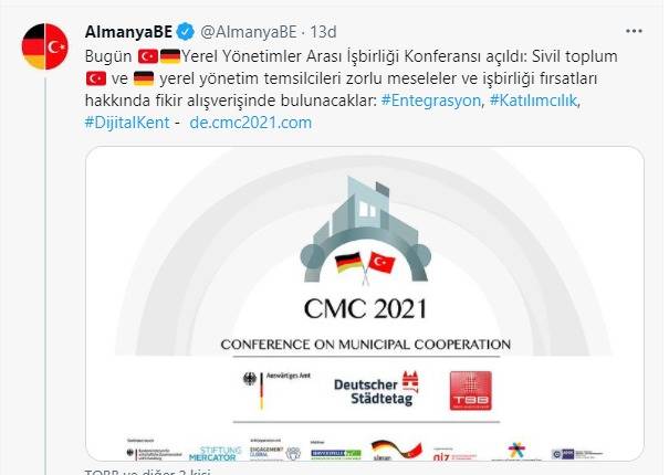 “Fırsatlar ve zorluklar, belediyeler ve sivil toplum arasında işbirliği”, “Kadına yönelik şiddet ve mültecilerin entegrasyonu, ruh sağlığı ve psikososyal destek” ile “Dijital şehir ve COVID-19” gibi konuların işleneceği Alman-Türk toplumsal işbirliği konferansı bugün başladığına dair açıklamada bulunan Almanya’nın Türkiye’deki Büyükelçiliği, “Bugün, Yerel Yönetimler Arası İşbirliği Konferansı açıldı: Sivil toplum ve yerel yönetim temsilcileri zorlu meseleler ve işbirliği fırsatları hakkında fikir alışverişinde bulunacaklar” ifadelerini kullandı.