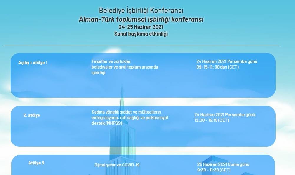 24-25 Haziran tarihleri arasında sanal ortamda gerçekleşecek olan Alman-Türk toplumsal işbirliği konferansı’nda Yerel Yönetimler Arası İşbirliği Konferansı ile sivil toplum ve yerel yönetim temsilcileri zorlu meseleler ve işbirliği fırsatları hakkında fikir alışverişinde bulunacaklar.