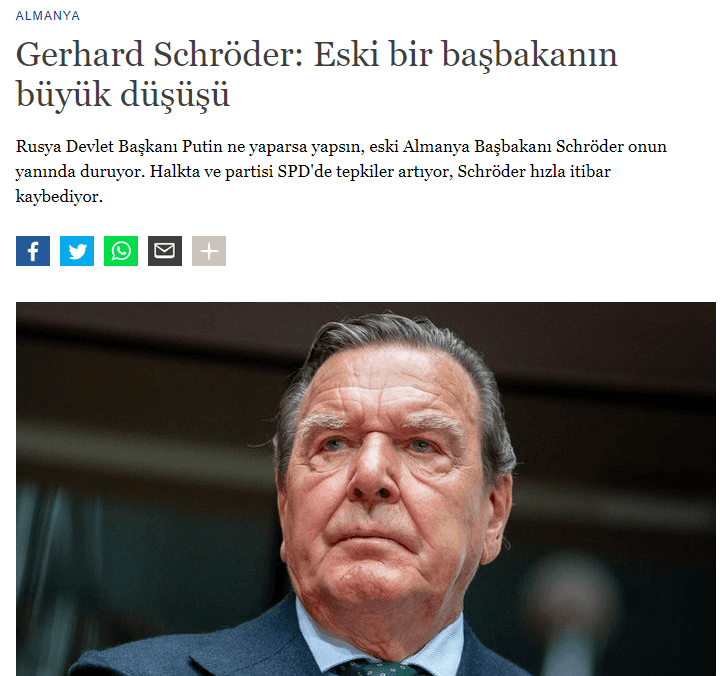 "Rusya Devlet Başkanı Putin ne yaparsa yapsın, eski Almanya Başbakanı Schröder onun yanında duruyor. Halkta ve partisi SPD'de tepkiler artıyor, Schröder hızla itibar kaybediyor." değerlendirmesi yapılan haberde, Schröder'in danışman olarak hizmet verdiği firmalarla iş akdinin feshedildiği aktarıldı: