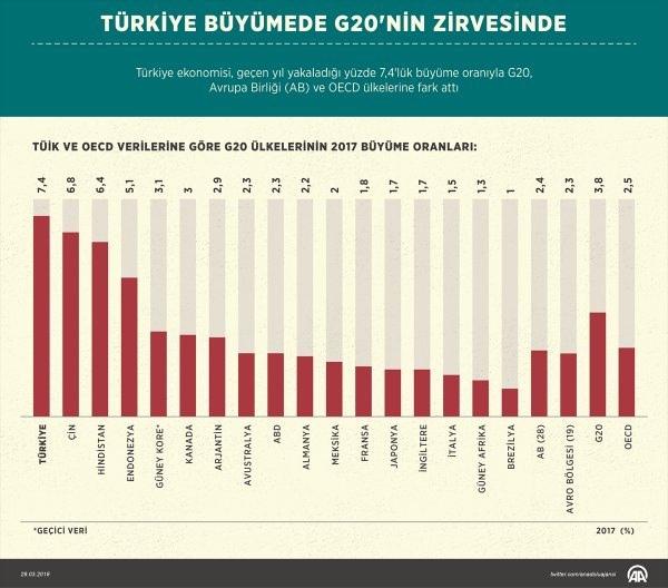 Türkiye ekonomisi, geçen yıl yakaladığı yüzde 7,4'lük büyüme oranıyla G20, Ekonomik İşbirliği ve Kalkınma Örgütü (OECD), Avrupa Birliği (AB) ülkelerine fark attı. AB ortalamasının yaklaşık 3 katı büyüyen Türkiye, dünyanın en hızlı gelişen ekonomilerinden Çin ve Hindistan'ı geride bırakarak G20'de zirvede yer aldı.