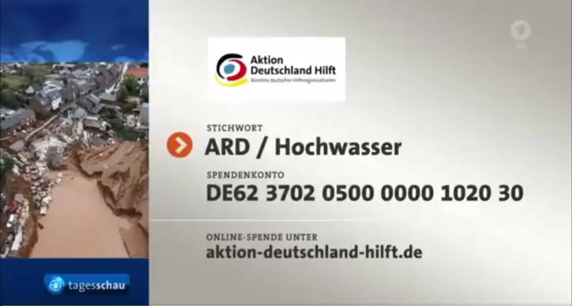 Alman devlet televizyonu Das Erste'de ise selden etkilenenler için halktan bağış talep edildi. Ana haber bülteni ekranlarından halka IBAN numaraları verilerek yardım çağrısı yapıldı.