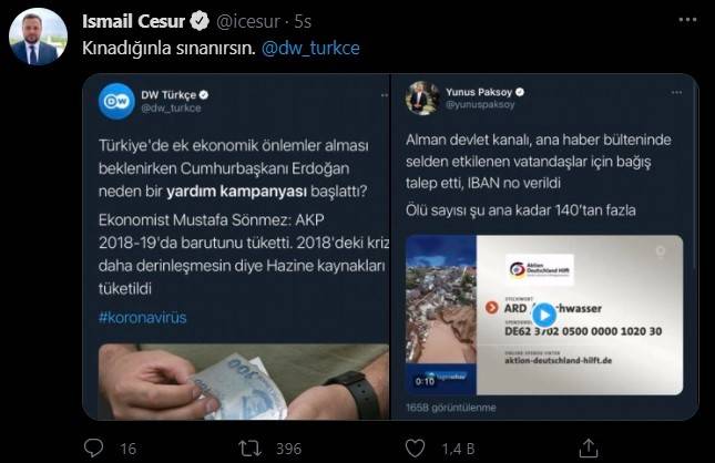 Koronavirüs pandemisine yönelik ihtiyaç sahibi dar gelirli vatandaşlar için Milli Dayanışma Kampanyası başlatan Cumhurbaşkanı Recep Tayyip Erdoğan'ı hedef alan Alman yayın organı DW Türkçe'ye, Cumhurbaşkanı Danışmanı İsmail Cesur'dan anlamlı bir eleştiri geldi.