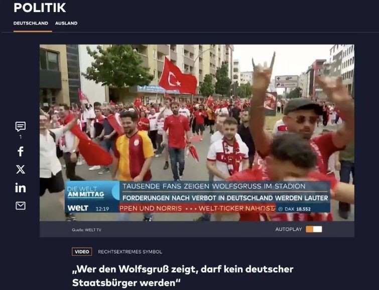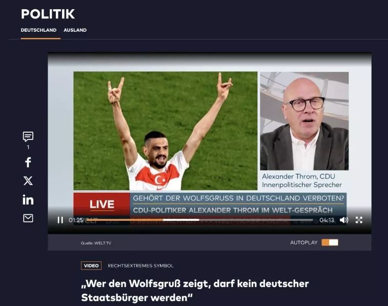 Welt'te yer alan haberde, "Tartışma yaratan kurt selamı, Türkiye Avrupa Şampiyonası çeyrek final maçında binlerce taraftar tarafından gösterildi. Giderek daha fazla politikacı, aşırı sağcı sembolün ve 'Bozkurtlar' örgütünün yasaklanması çağrısında bulunuyor. CDU siyasetçisi Alexander Throm da acilen harekete geçilmesi gerektiğini düşünüyor." ifadeleri kullanıldı.