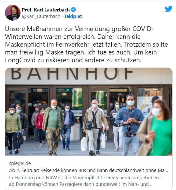 Buna karşın Sağlık Bakanı, vatandaşlara toplu taşımada gönüllü olarak maske takma çağrısı yaptı. Sosyal medyadan paylaşım yapan Lauterbach, “Covid kış dalgalarını engellemeye yönelik önlemlerimiz başarılı oldu. Bu nedenle şehirler arası seyahatlerde maske takma zorunluluğu şimdi kalkabilir. Ancak gönüllü olarak maske takılması gerekir. Ben yapıyorum. Uzun Covid (Long Covid) riski almamak ve başkalarını korumak için…” dedi.