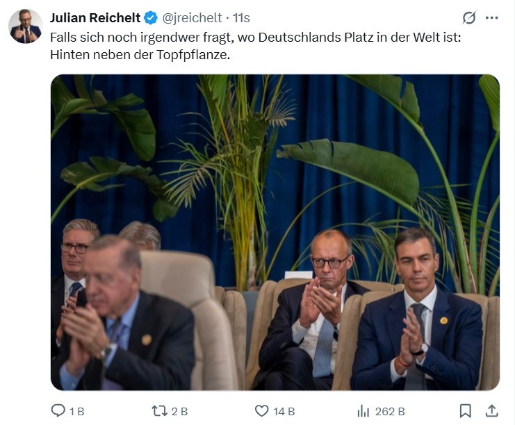 Mısır’ın Şarm el-Şeyh kentinde gerçekleştirilen Gazze Zirvesi, yalnız diplomatik başlıklarıyla değil, protokol düzeni ve oturma planı üzerinden yapılan yorumlarla da gündem yaratıyor. Ünlü Alman gazeteci Julian Reichelt, sosyal medya hesabından paylaştığı bir kareye “Almanya’nın dünyadaki yeri neresi diye merak eden varsa: saksı bitkisinin arkasında.” notunu düşerek Almanya’nın zirvedeki görünürlüğüne ironik bir gönderme yaptı.