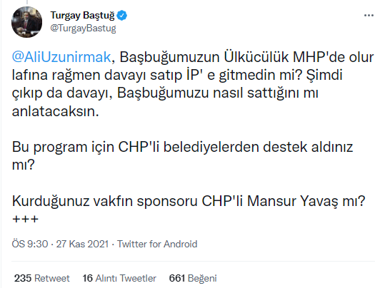 "Başbuğumuzun 'Ülkücülük MHP'de olur' lafına rağmen davayı satıp İP'e gitmedin mi? Şimdi çıkıp da davayı, Başbuğumuzu nasıl sattığını mı anlatacaksın. Bu program için CHP'li belediyelerden destek aldınız mı? Kurduğunuz vakfın sponsoru CHP'li Mansur Yavaş mı?"