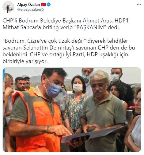 AK Parti İzmir Milletvekili Alpay Özalan, CHP'li Bodrum Belediye Başkanı Ahmet Aras'ın terör örgütü PKK'nın çıkardığı yangın bölgesini ziyaret eden örgütün siyasi uzantısı HDP'ye bilgi vermesini eleştirdi.