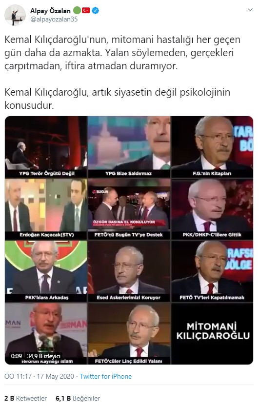 Sosyal medya hesabından paylaşımda bulunan AK Partili Alpay Özalan, "Kemal Kılıçdaroğlu'nun, mitomani hastalığı her geçen gün daha da azmakta. Yalan söylemeden, gerçekleri çarpıtmadan, iftira atmadan duramıyor. Kemal Kılıçdaroğlu, artık siyasetin değil psikolojinin konusudur." ifadelerini kullandı.