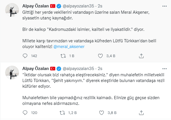 İYİ Parti Grup Başkanvekili Lütfü Türkkan'ın bir şehit yakınının kız kardeşine ettiği iğrenç küfrü eleştiren AK Parti İzmir Milletvekili Alpay Özalan, İP Genel Başkanı Meral Akşener'in, "Kadromuzdaki isimler, kaliteli ve liyakatlidir." sözlerini hatırlattı.