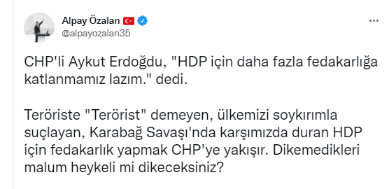 AK Parti İzmir Milletvekili Alpay Özalan, CHP İstanbul Milletvekili Aykut Erdoğdu'nun "HDP için daha fazla fedakarlığa katlanmamız lazım." sözlerine tepki gösterdi.