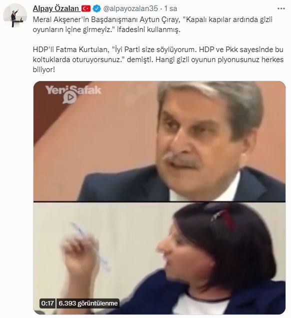 AK Parti İzmir Milletvekili Alpay Özalan’dan, "Kapalı kapılar ardında gizli oyunların içine girmeyiz." ifadesini kullanan Aytun Çıray’a tepki geldi. Özalan sosyal medya hesabı üzerinden yaptığı paylaşımda, “Meral Akşener'in Başdanışmanı Aytun Çıray, "Kapalı kapılar ardında gizli oyunların içine girmeyiz." ifadesini kullanmış. HDP'li Fatma Kurtulan, "İyi Parti size söylüyorum. HDP ve PKK sayesinde bu koltuklarda oturuyorsunuz." demişti. Hangi gizli oyunun piyonusunuz herkes biliyor!” ifadelerini kullandı.