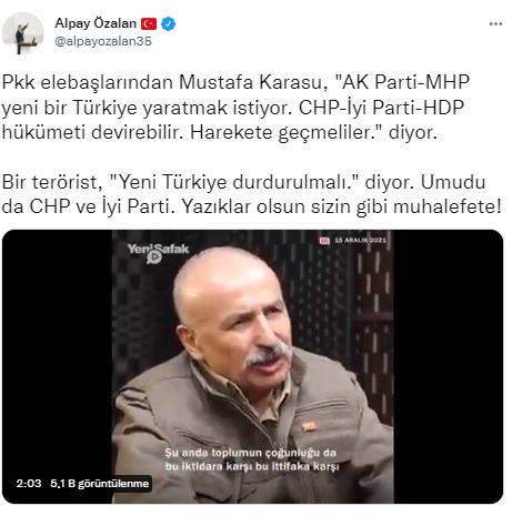 Twitter hesabından paylaşımda bulunan Özalan, “PKK elebaşlarından Mustafa Karasu, ‘AK Parti-MHP yeni bir Türkiye yaratmak istiyor. CHP-İyi Parti-HDP hükümeti devirebilir. Harekete geçmeliler’ diyor. Bir terörist, ‘Yeni Türkiye durdurulmalı’ diyor. Umudu da CHP ve İYİ Parti. Yazıklar olsun sizin gibi muhalefete!” ifadelerine yer verdi.