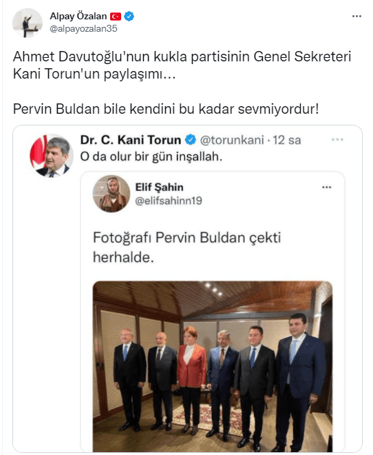 Gelecek Partili Kani'ye tepki gösteren AK Parti İzmir Milletvekili Alpay Özalan, "Ahmet Davutoğlu'nun kukla partisinin Genel Sekreteri Kani Torun'un paylaşımı. Pervin Buldan bile kendini bu kadar sevmiyordur!" tepkisini gösterdi.