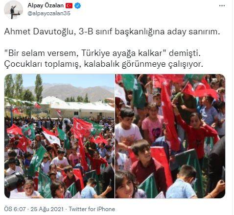AK Parti İzmir Milletvekili Alpay Özalan'ın, mitingde çocuklarla kalabalık oluşturmaya çalışan Ahmet Davutoğlu ile ilgili "3-B sınıf başkanlığına aday sanırım" paylaşımı güldürdü.