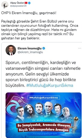 Şehir Eren Bülbül’ün yerine reklam filminde kendisini canlandıran oyuncunun fotoğrafının kullanıldığı afişi paylaşan CHP’li İstanbul Büyükşehir Belediye Başkanı Ekrem İmamoğlu’nun paylaşımına AK Parti İzmir Milletvekili Alpay Özalan’dan tepki geldi. Özalan sosyal medya hesabı üzerinden yaptığı paylaşımda, “CHP'li Ekrem İmamoğlu, şaşırtmadı! Paylaştığı görselde Şehit Eren Bülbül yerine onu canlandıran oyuncunun fotoğrafı kullanılmış. Onca tepkiye rağmen de düzeltilmiyor. Hata mı gündem olmak için bilinçli yapılmış rezil bir taktik mi? Bu şahıstan her şey beklenir” ifadelerini kullandı.