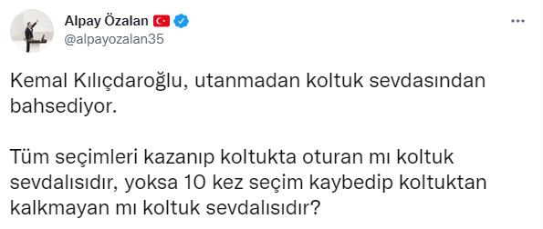 Özlan yaptığı paylaşımda, “Kemal Kılıçdaroğlu, utanmadan koltuk sevdasından bahsediyor. Tüm seçimleri kazanıp koltukta oturan mı koltuk sevdalısıdır, yoksa 10 kez seçim kaybedip koltuktan kalkmayan mı koltuk sevdalısıdır?” ifadelerini kullandı.