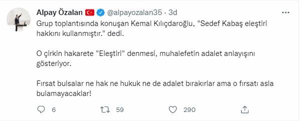 Grup toplantısında "Sedef Kabaş eleştiri hakkını kullanmıştır” CHP Genel Başkanı Kemal Kılıçdaroğlu’na, AK Parti İzmir Milletvekili Alpay Özalan’dan tepki geldi. Özalan sosyal medya hesabı üzerinden yaptığı paylaşımda, “Grup toplantısında konuşan Kemal Kılıçdaroğlu, ‘Sedef Kabaş eleştiri hakkını kullanmıştır.’ dedi. O çirkin hakarete "Eleştiri" denmesi, muhalefetin adalet anlayışını gösteriyor. Fırsat bulsalar ne hak ne hukuk ne de adalet bırakırlar ama o fırsatı asla bulamayacaklar!” ifadelerini kullandı.