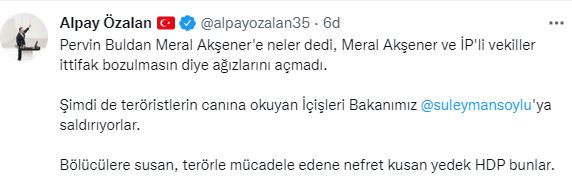 İYİ Parti Genel Başkanı Meral Akşener’in HDP’li Pervin Buldan’ın kendisine karşı kullandığı ifadeleri kulak ardı ederek İçişleri Bakanı Süleyman Soylu’yu hedef alması tepkilere neden oldu. Akşener’e AK Parti İzmir Milletvekili Alpay Özalan sosyal medya üzerinden yaptığı paylaşım ile tepki gösterdi.