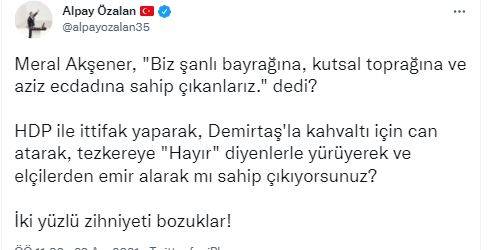 Resmi sosyal medya hesabından paylaşımında bulunan Türkiye Büyük Millet Meclisi (TBMM) İdare Amiri ve AK Parti İzmir Milletvekili Alpay Özalan, “ Meral Akşener, ‘Biz şanlı bayrağına, kutsal toprağına ve aziz ecdadına sahip çıkanlarız’ dedi? HDP ile ittifak yaparak, Demirtaş'la kahvaltı için can atarak, tezkereye ‘Hayır’ diyenlerle yürüyerek ve elçilerden emir alarak mı sahip çıkıyorsunuz? İkiyüzlü zihniyeti bozuklar!” ifadelerine yer verdi.