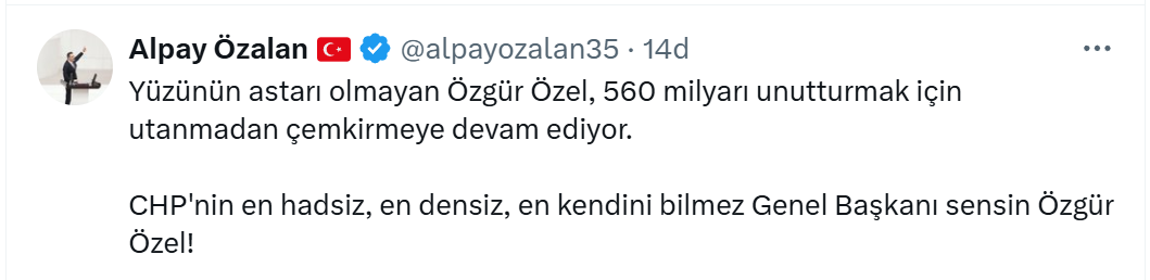 Cumhurbaşkanı Erdoğan'ı skandal sözlerle hedef alan CHP Genel Başkanı Özgür Özel'e her kesimden tepki yağarken son olarak TBMM İdare Amiri - AK Parti İzmir Milletvekili Alpay Özalan’dan konuya ilişkin sert bir açıklama geldi.