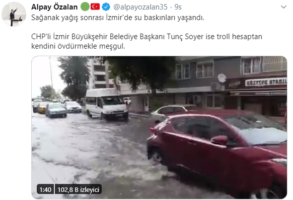 Özalan sosyal medya hesabından yaptığı paylaşımda, ''Sağanak yağış sonrası İzmir'de su baskınları yaşandı. CHP'li İzmir Büyükşehir Belediye Başkanı Tunç Soyer ise troll hesaptan kendini övdürmekle meşgul.'' ifadeleriyle tepki gösterdi.