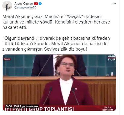 Sosyal medya hesabından paylaşımda bulunan AK Parti İzmir Milletvekili Alpay Özalan, “Meral Akşener, Gazi Meclis'te "Yavşak" ifadesini kullandı ve millete sövdü. Kendisini eleştiren herkese hakaret etti. ‘Olgun davrandı’ diyerek de şehit bacısına küfreden Lütfü Türkkan'ı korudu. Meral Akşener de partisi de zıvanadan çıkmıştır. Seviyesizlik diz boyu!” ifadelerine yer verildi.