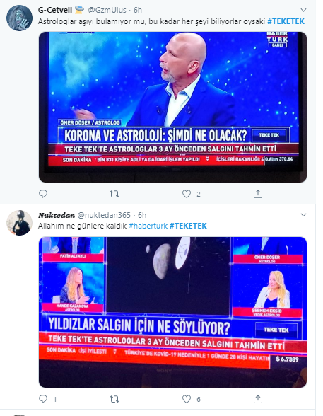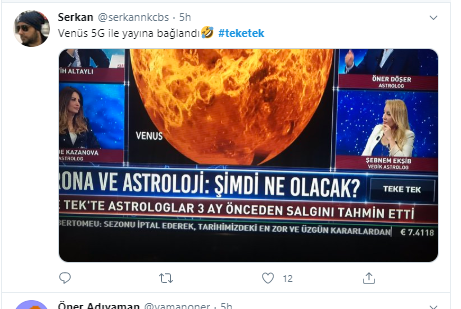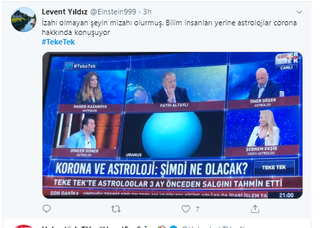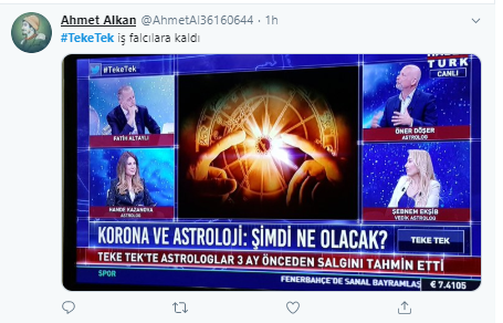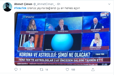 Öner Döşer adlı astrolog güneşin hareketliliğine bakarak koronavirüsün daha da artacağını iddia etti. Baştan aşağı saçmalıklarla dolu programda ekonomiyi bile yorumlamayı ihmal etmediler.