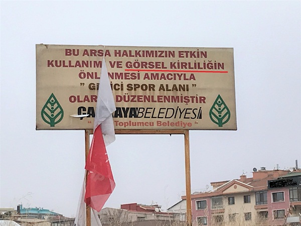 Ankara'nın gözde mevkilerinden, Balgat'ta MHP Genel Merkezi'nin tam karşısında bir arsa bulunuyor. Arsanın girişinde CHP'li Çankaya Belediyesi'nin "Bu arsa halkımızın etkin kullanımı ve görsel kirliliğin önlenmesi amacıyla 'Geçici Spor Alanı' olarak düzenlenmiştir. Çankaya Belediyesi. Yeni Toplumcu Belediye" klişe ifadesi bulunan yazılı tabelası yer alıyor. Ancak bizzat tabelanın kendisi paslı haliyle "görüntü kirliliği" oluşturuyor.