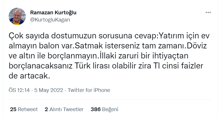 Ramazan Kurtoğlu yaptığı açıklamada, "Çok sayıda dostumuzun sorusuna cevap: Yatırım için ev almayın balon var. Satmak isterseniz tam zamanı. Döviz ve altın ile borçlanmayın. İllaki zaruri bir ihtiyaçtan borçlanacaksanız Türk lirası olabilir zira TL cinsi faizler de artacak" dedi.